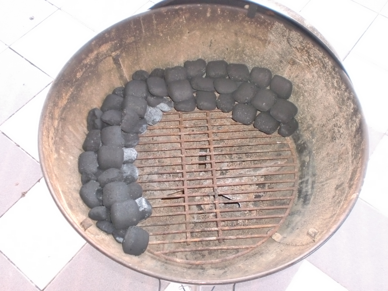 Minion-Ring gelegt, aus einem Rest Weber-Briketts und meinem WIntervorrat "Grillis"