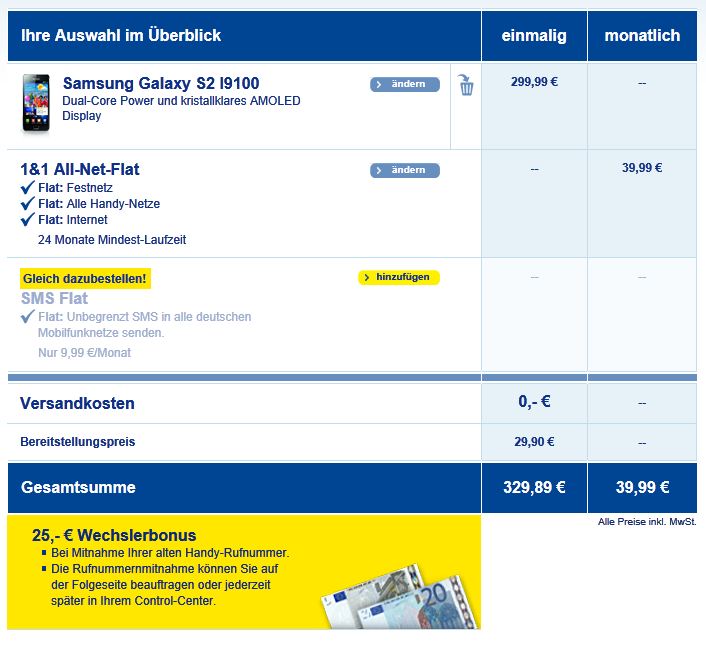 - 25,- € Wechslerbonus, bei Mitnahme Ihrer alten Mobilfunkrufnummer. Zur Verrechnung mit den monatlichen Grundgebühren nach erfolgreicher Rufnummernportierung.