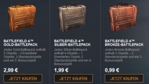 Battlefield 4 führt Mikrotransaktionen ein: Wer künftig keine Lust mehr hat, Battlepacks und damit Waffenzubehör, XP-Boosts, Profilbilder oder Dogtags freizuspielen, der kann diese seit dem 27. Mai 2014 auch schlicht kaufen. Über alle Plattformen hinweg kostet ein bronzenes Battlepack einen, ein silbernes zwei und ein goldenes drei Euro. Für zwölf Euro gibt es fünf goldene Battlepacks, eines ist also geschenkt.